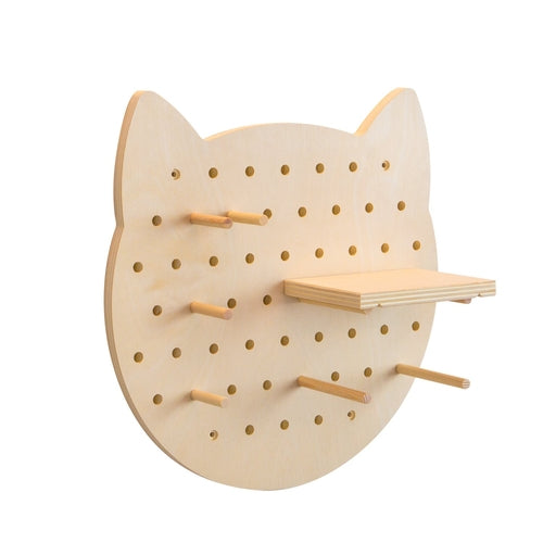 This pegboard wall rack is in a cute kitty shape and made of 12mm plywood. The main board is equipped with four big pegs, four small pegs and one rectangular shelf. The pegs can be used as hooks. Two pegs and one shelf together can be combined into storage racks and placed wherever is needed on the main board for multiple storage purposes, , jewels and placing small plants, photo • Including 1x plywood main board (L30cm, H30cm, T12mm), 4x solid pine wood pegs Large (D8mm, L9cm), 4x solid pine wood pegs Small (D8mm, L5cm), 1x rectangular plywood shelf (L13cm, W9cm, T12mm)